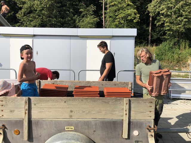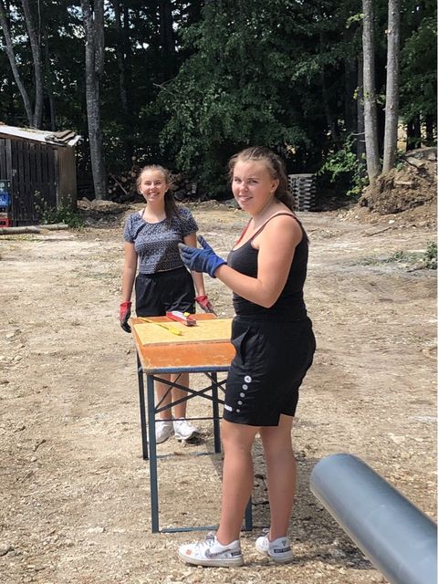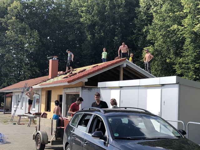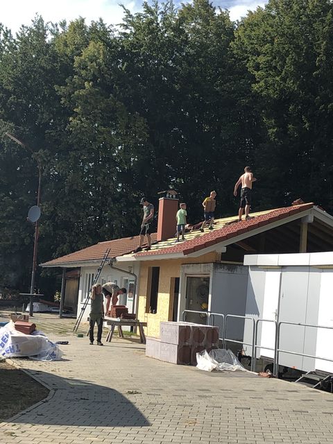 Aber auch rund ums Häusle wurde wieder viel geschafft und einiges erledigt. Die beiden Mädels und die Männer, haben an der Dachverlängerung weiter gearbeitet. Die neue Dachrinne wurde angebaut und die Wände wurden isoliert. Der Graben für die neuen Wasser- und Stromleitungen wurde wieder verschlossen. Und der Platz rund um die Grillstelle wurde wieder hergerichtet. Hierzu einen herzlichen Dank an Nikolai Kloss der sich mit seinem Bagger bereit erklärt hat, dies zu übernehmen.