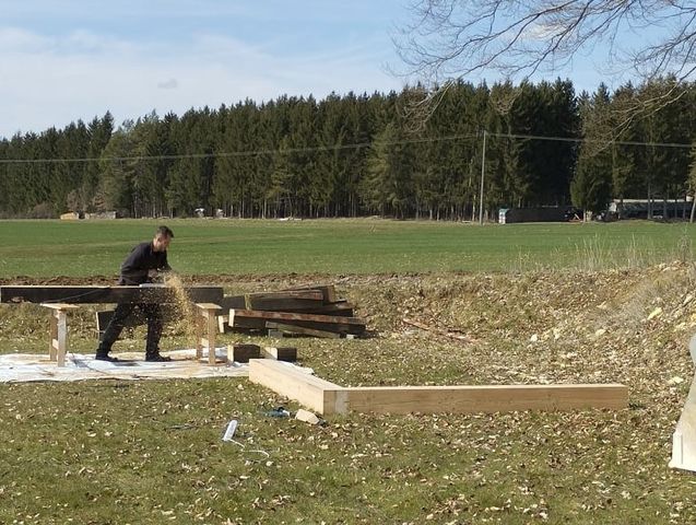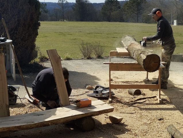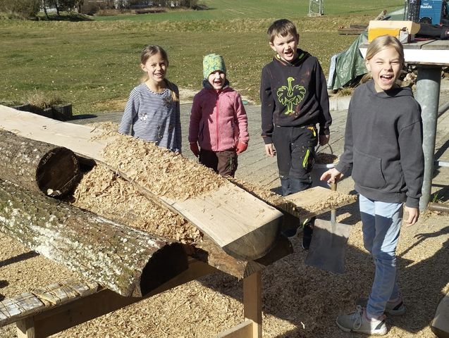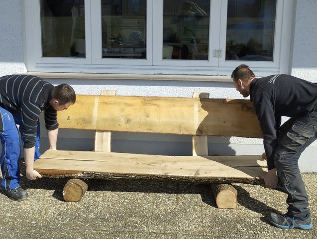 Unser „Holzteam“ hat, die hinterm Häusle aufbewahrten Eichenstämme, abgehobelt, zurecht gesägt und einige Bänke zum Verweilen daraus gebaut.