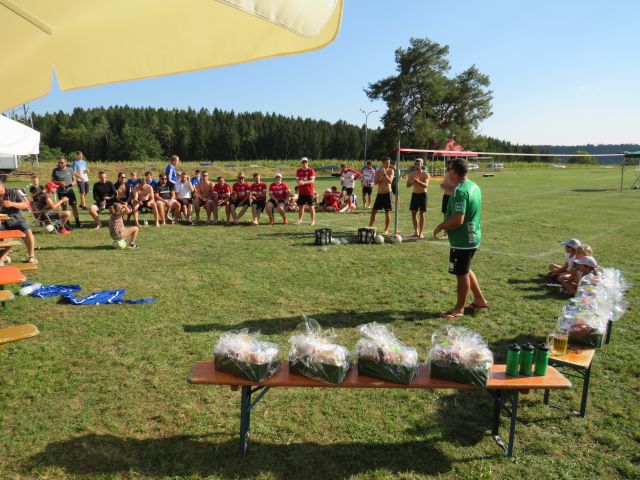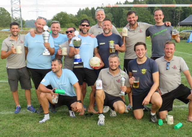 In diesem Jahr traten am Samstag beim Laienturnier 19 Mannschaften gegeneinander an. Abteilungsleiter Pascal Kloss begrüßte zusammen mit Vorstand Marius Heim, die vielen Mannschaften aus nah und fern. Bei schönstem Wetter und heißen Temperaturen konnten unsere Spielleiter: Christian Eisele und Niels Bühler, pünktlich gegen 10 Uhr mit dem Turnier beginnen. Auch unsere jüngste aktive Faustball-Mannschaft nahm es gegen die Laien auf. Was kein Leichtes ist, da auch viele ehemalige Faustballer mitspielen. Es wurde in 2 Vorrunden gespielt und anschließend daran, die Platzierungen.