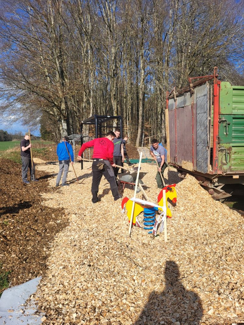 Auf unserem Spielplatz haben wir ein neues Spielgerät aufgebaut, die Fallfläche erweitert und die Hackschnitzel aufgelockert und neu aufgefüllt.
