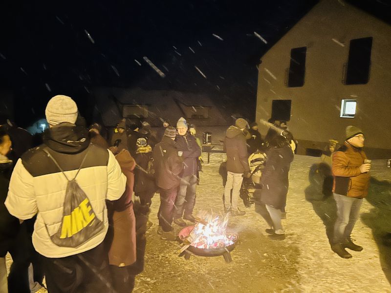 Gemeinsam ging es Richtung Hochberg. Am Ortsende musste man ein Stück auf der Hauptstraße laufen. Durch die Fackeln waren die Wanderer von weitem gut zu erkennen. Am Hausbuchenberg ging es am Wald entlang hoch. Bei Pfisters gab es eine kleine Zwischenstation, wobei man sich mit warmen Getränken oder am romantischen Feuer aufwärmen konnte. Mit dem einsetzenden Schneefall wurde es dann noch so richtig winterlich.