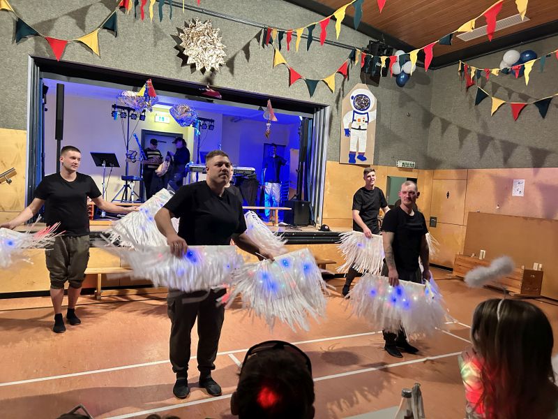 Nach einer kurzen Tanzrunde brachte die Veringendorfer Guggenmusik „GuMuVeDo“ den Saal zum Beben. Als krönenden Abschluss konnte das Veringer Männerballett, unter neuer Leitung von Dajana Brehm, ihre legendären Tanzkünste zum Besten geben. Mit einem lautstarken Applaus forderten die Zuschauer eine Zugabe. Dieser kamen die Männer gleich nach. Zum Abgang traf man sich beim gemütlichen Ausklang bei den Astronautinnen an der Bar.