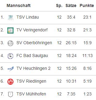Der Kampf um den Meistertitel war spannend bis zum Schluss. Im ersten Spiel des Tages stand der TV Veringendorf (2. Tabellenplatz), dem TSV Lindau (1. Platzierter) gegenüber. Wie sich schon an den vergangenen Spieltagen gezeigt hat, ist Lindau der wohl stärkste Gegner dieser Saison. Die Lindauer waren bis dato ohne Punktverlust unterwegs.